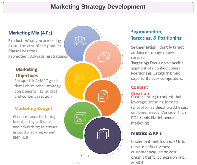 Importance: This section outlines the strategic framework for marketing, including detailed KPIs, go-to-market (GTM) strategies, and the balance between field and digital marketing.